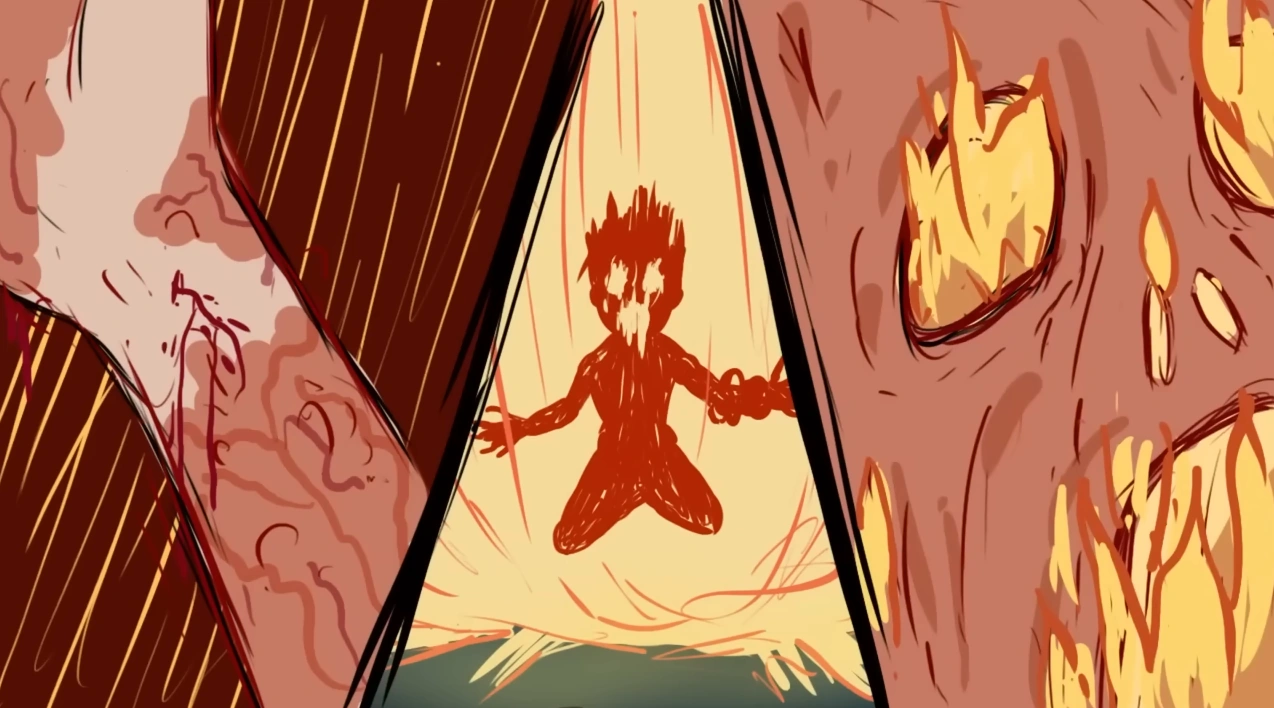 Ben's transformation into Heatblast: his skin burns and boils from the inside, feeling his flesh scorching painfully.