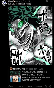 The meme found its way to X with a post from user @Tesso_dan, where Deku was portrayed as angry and violent after his victory over Miles, demanding more "street tiers" (specifically Daredevil and Black Widow, both also from Marvel Comics). The meme began to evolve, portraying Deku as a violent bully that sought out Street Tiers to battle in order to boost his own ego and reputation. The meme began crossing over with other memes/in-jokes in the DEATH BATTLE community, and later evolved again. Deku was portrayed as having gained the ability to defeat any Street Tier, and that if any opponent was touching a street or road, he gained the ability to defeat them regardless of their true power or scaling. Memes of Deku defeating characters such as Goku from Dragon Ball, Godzilla from the Godzilla franchise, Superman from DC Comics, and Simon the Digger from Gurren Lagann (all of whom are tiered at Multiversal levels) abounded. Additionally, edits of images of the character Kure Raian from the series Kengan Ashura with Deku's hair and features grew popular, depicting Deku as a deranged lunatic seeking opponents.