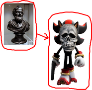 He appears like Shadow but with black eyes with green pupils inside, he cries green blood, he is smiling and is colored dark green wherever Shadow is colored red.