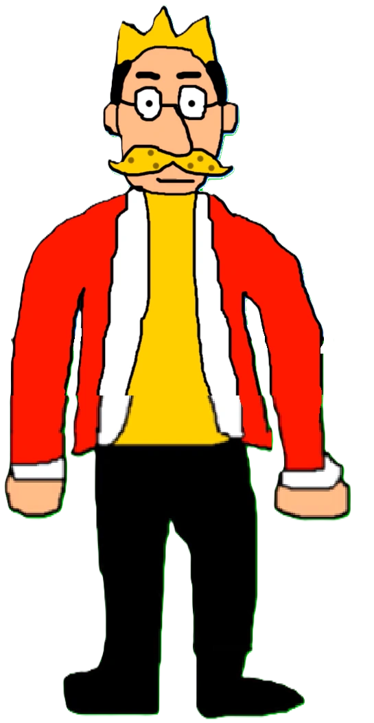 He has black hair, A yellow crown and a yellow mustache. Glasses, A Robe Royal, yellow shirt, and black pants and shoes.