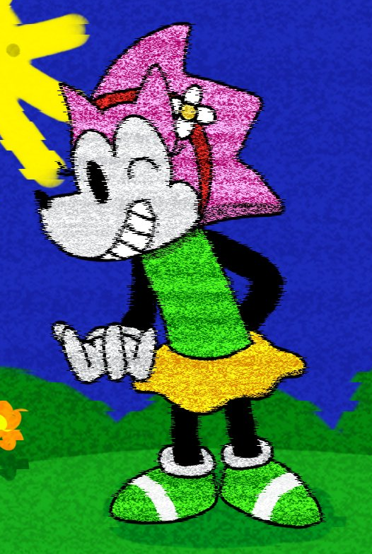 Meadow appears to resemble a pink, 2D cartoon hedgehog wearing a green shirt and shoes, the latter featuring a white strap and cuffs, as well as wearing a yellow skirt. She has a white-colored muzzle and gloves, black arms and legs, a red headband with a flower on it and cartoony black eyes. Her monster form greatly exaggerates her appearance into making her more demonic and monstrous, appearing with giant black eyes, razor sharp teeth and multiple arms.