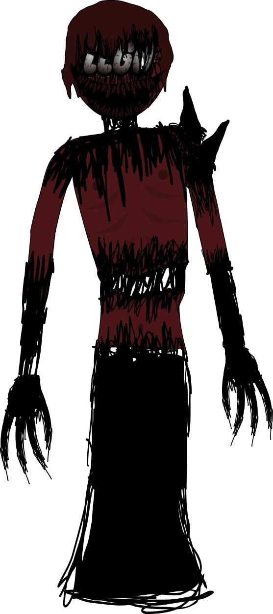 He is larger than his Bedrageri Form except his legs are fused caused by the same black substance that is coming out of his eyes. he is upper and lower half of his body are split while being supported by the black goo, His neck, and lower arms, shoulders and his hair are also covered in the black goo. His smile became larger and his teeth are now sharp and cracked. His eye is larger and his white pupil is large as well. He has two spikes on his right shoulder.