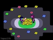 Papyrus retells us the same backstory from above, and after he finishes, he proceeds to run into the Flower King and attempt to open a dark fountain, as Kris, Susie and Sans chase him, while Noelle stays behind in confusion. We see Rory Nyte and Sans enter the Flower King. As the fourth and final animation "Flower King Dark World Reveal", the Knight succesfully opened another fountain, as Kris and Susie enter it and have a fight with Flowey/"Wofley the Flowery Boy". We also get the reveal that the Sans Deltarune is somehow still alive.