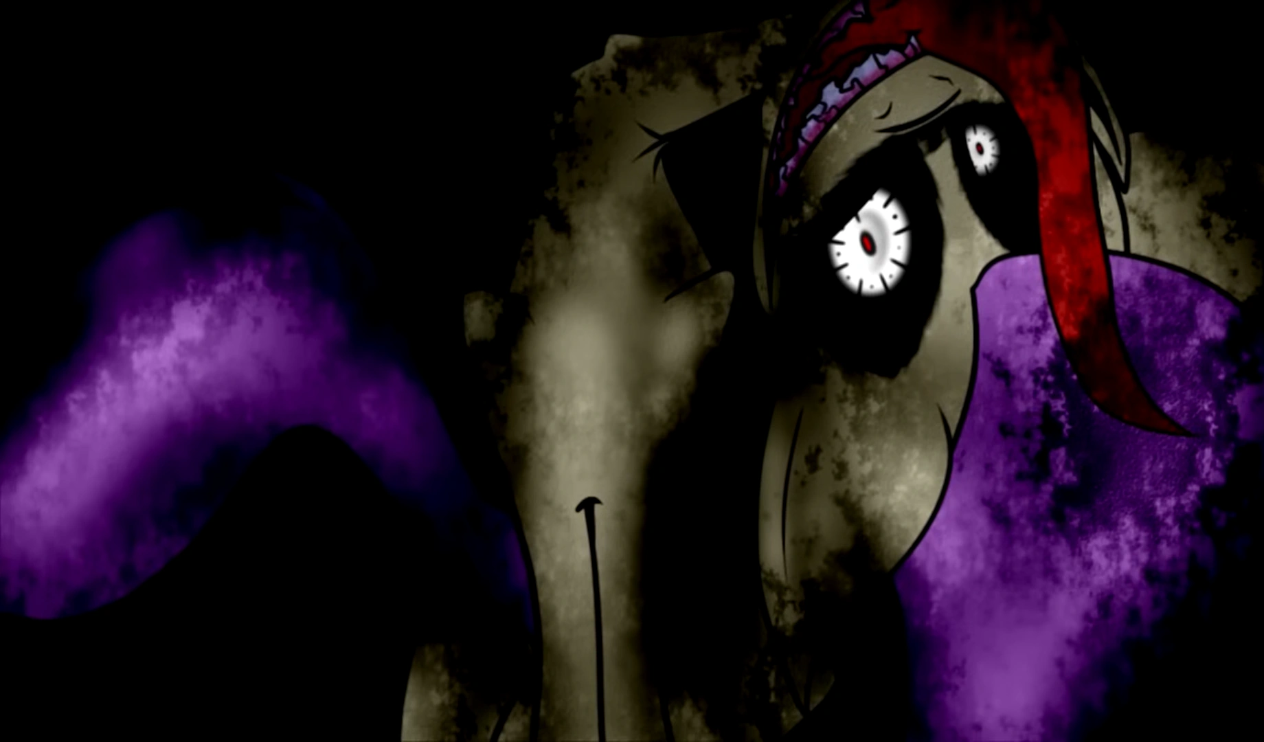 On the second night, the creature returned but with a dark red stain across the left of its cheek, implying it might've killed something. It continued to tap on the glass while still claiming it was cold out there. But Apple Bloom knew it was lying since it was warm outside at night despite it being Spring.