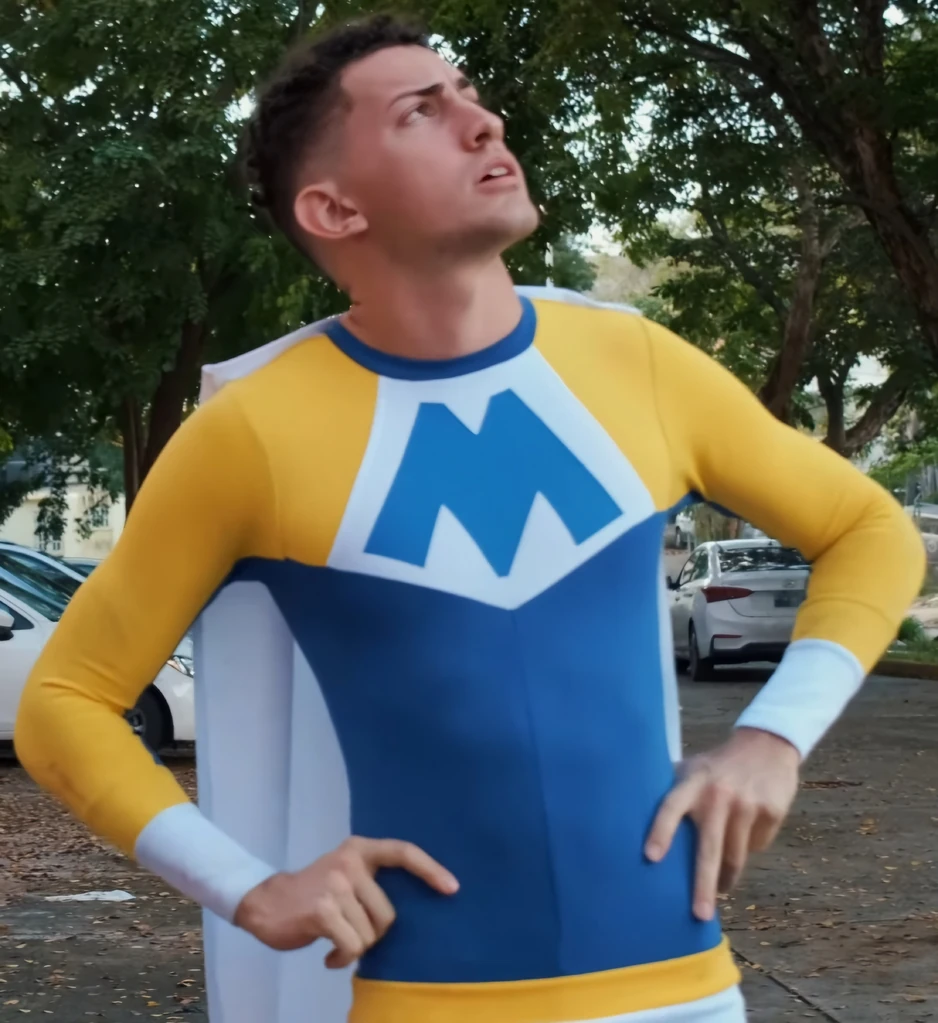 The Monolith is first mentioned right at the beginning of the story, being heard as the subject of a podcast that discusses his most recent act of heroism, in which he defeated one of the biggest gang leaders in town. Mick is a lifelong fan of the superhero, even having a poster of him in his room. Later that day, Mick leaves his house to go to the store to get some groceries. Just as he parks his bike, he overhears some suspicious activity in the back. Curiosity gets the better of him, and Mick sneaks to the source of the noise, where he discovers two men trying to dispose of a dead body. Horrified, Mick tries to quietly sneak away, but he accidently steps on an empty soda can, which alerts the thugs, and a chase ensues.