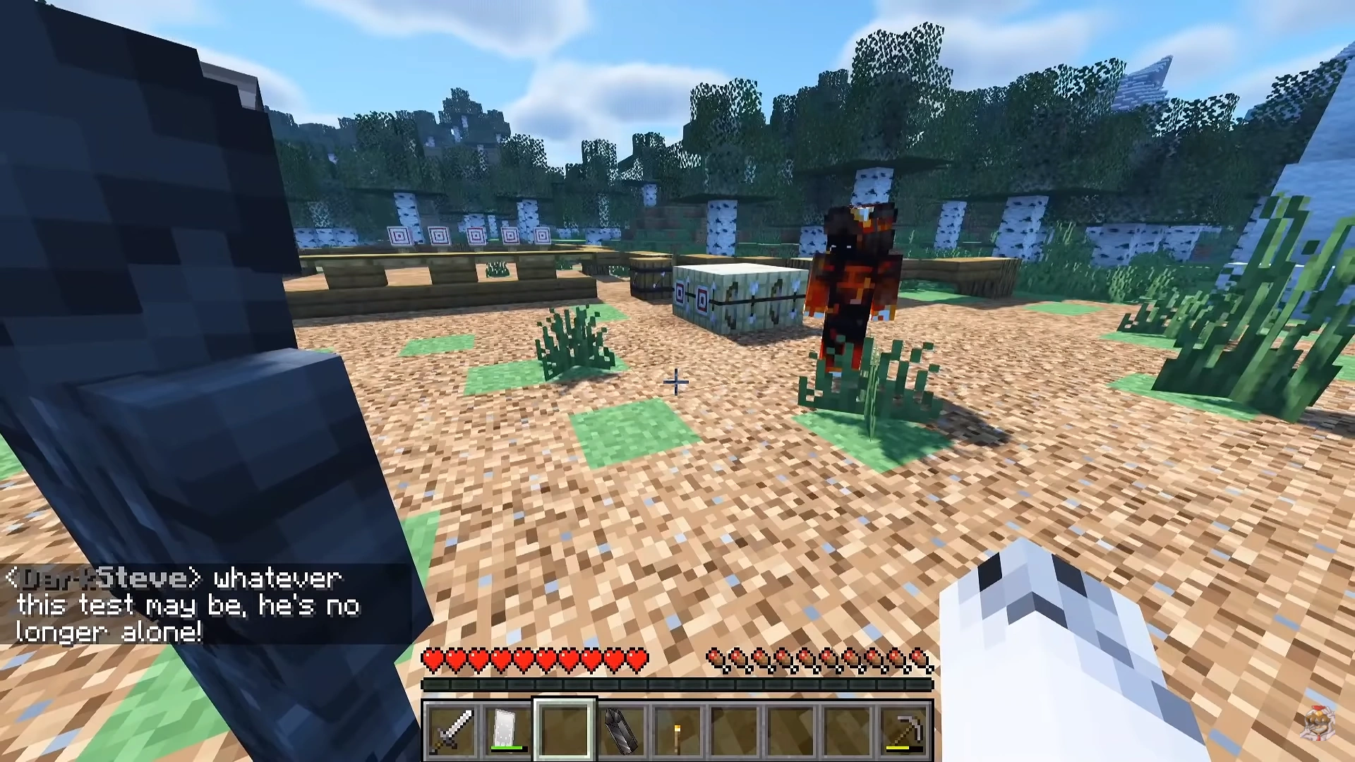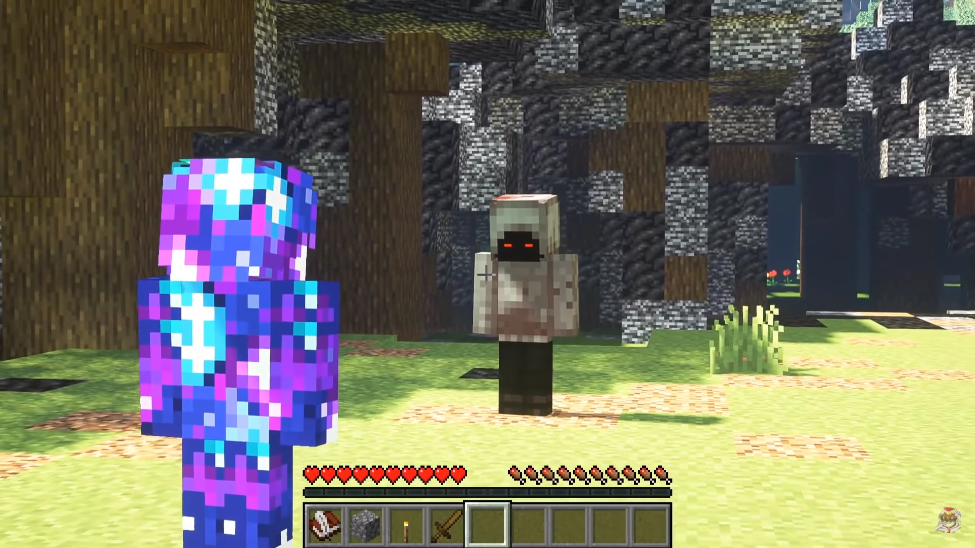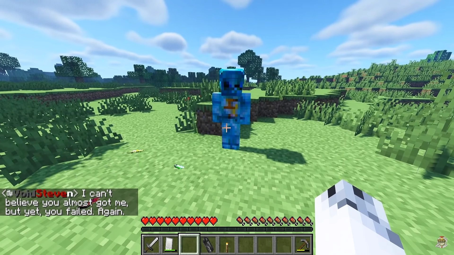 After a painful epoch of remaining dormant inside the Void, Void Steve, with his connection to the tomb, was able to detect the presence of another living being, a human by the name "FavreMySabre". Seeing that this was his only opportunity to enact on his escape plan, Void used his Blue Spirit projection to lure Sabre to the tomb. As Sabre was crafting some tools to use, he barely noticed the shadowy projection lurking between the trees until it left. Although Sabre debated just moving on and instead cutting down some trees, he felt inclined to go after the shadow and found it behind a tree, startling him. Sabre tried to initiate a conversation with the shadow, but it quickly walked away, leading Sabre closer to the tomb as he equipped a sword for defense purposes. Sabre chased down the shadow until the two cave across the entrance to the tomb, with the shadow running inside as Sabre stood in awe of it.