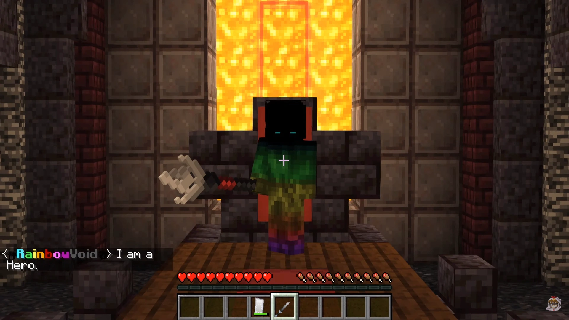 After ages of waiting, Void Steve finally revealed his true colors to Rainbow Steve and locked him in a machine, intending to extract the crystals from him and be reborn as the Hero again. However, Rainbow Steve sent out a distress signal in the form of a portal to the Sabre and Elemental Steve's new hideout; the Rainbow Bunker. Seeing that this could only mean Rainbow Steve was truly in danger, Sabre and Elemental ventured through and found Void Steve inside the exact same temple where Sabre and Red Steve discovered the false prophecy and unleashed the Darkness. Void Steve wasted no time in letting Sabre admire his work and view Rainbow Steve. Void Steve ordered both Soul and Corruption to block the exit as Sabre revealed that he had discovered Void Steve's identity through the help of one of his old friends, a Red Steve who had long since passed away and who knew Void Steve back when he was the original hero. Void Steve stated that Sabre wouldn't understand and relayed the Darkness' motto before raging at Sabre, claiming that Sabre is his "design" and that he was the Blue Spirit who lured him into the tomb.