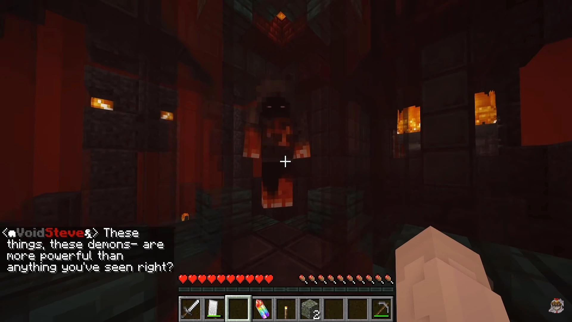 Void Steve speaking to Sabre in the World Below about how to defeat the Demon Steves.