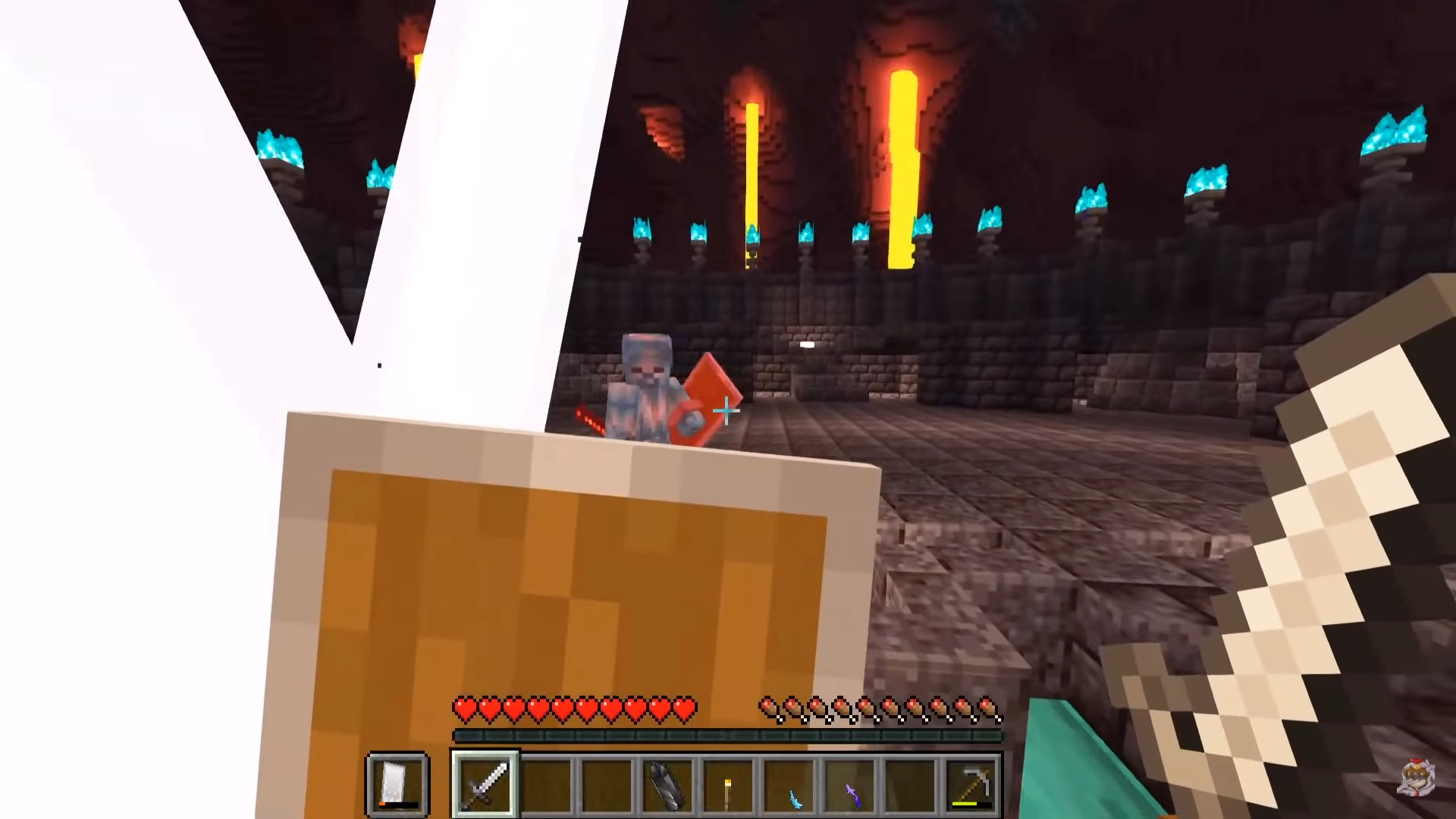 Blue Spirit about to teleport Sabre to the portal leading to the Steves' world.