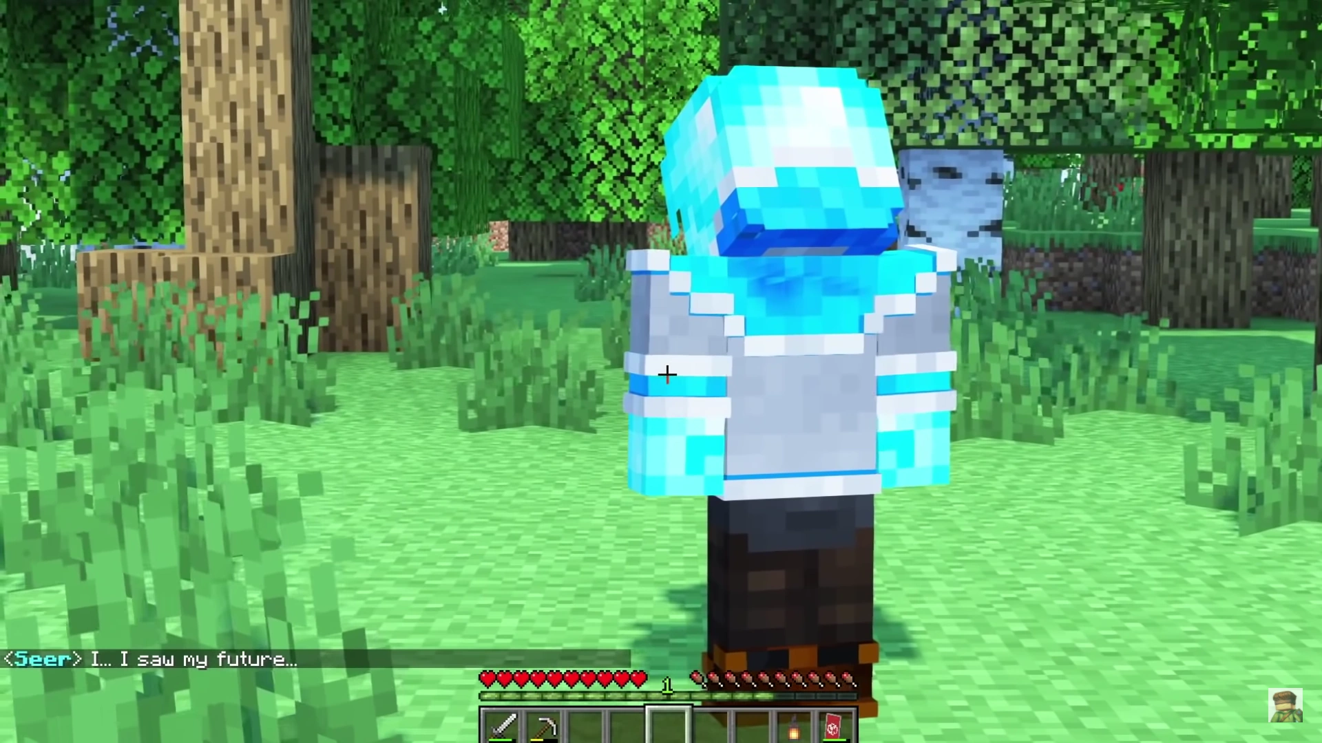 Afterwards, Dream Steve teleported them to the Desert Steve Village where they found the remaining Forest Steve's infected and being surveyed by Genesis. As Dread Steve's influence began spreading more, Dream realized that they had to take the fight to Dread himself. Before leaving, Seer confronted Colle about what Dread said to him during their confrontation and could tell that he had said something to shake Colle up. Colle revealed that Dread had asked him what his greatest fear was, confirming that Dread spreads his influence through doubt, concerning Seer as the two set off to the Diamond Steve Stronghold. Eventually they found the Obsidian Steve's and Colle managed to recruit the Obsidian Captain to their cause and brought him down into the Diamond Steve Stronghold where they found Dread Steve waiting for them. Dread managed to incapacitate Colle and Seer, showing them illusions. However, while Dread showed Colle his greatest fears, Dread showed Seer visions of his future, which was completely devoid of light and goodness. Eventually, Seer managed to wake up and help Colle, the Obsidian Captain and the Judge in the fight against Dread Steve. Although he was on his last bit of life, Dread claimed that there was something far worse than him waiting for the group after his death. However, Seer, full of hatred, exclaimed that Dread needed to die and struck him down with lightning, killing him. Seer apologized for his hasty actions and he and Colle left the Diamond Steve Stronghold where they found Dream Steve atop the mountain nearby.