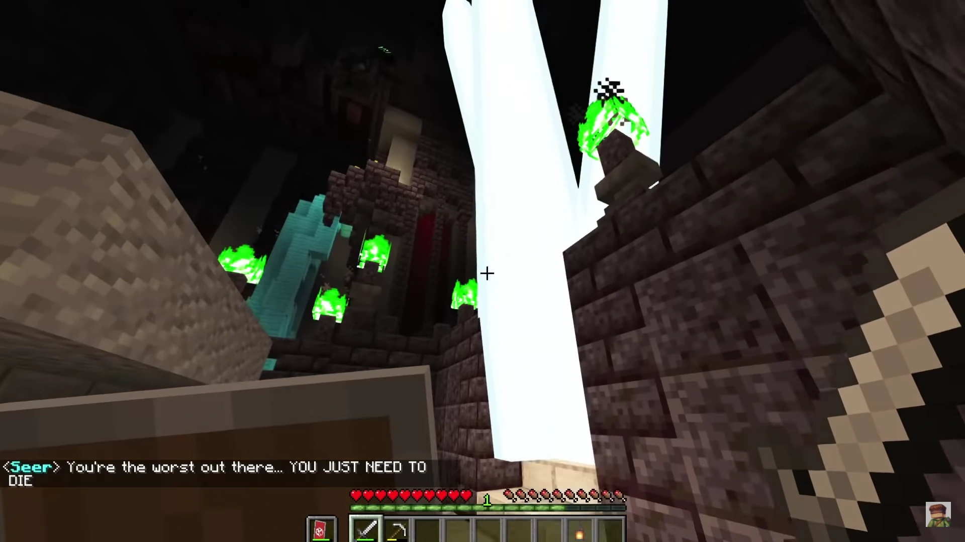 As Void Steve wandered elsewhere, Colle was teleported by Galaxy Steve to a temple that Void had recently set up, containing the Rainbow Crystals, several pieces of machinery and a journal documenting his findings on redstone energy and how to create a copy of a Steve. Before Colle could take the crystals, Void appeared behind him, having anticipated his arrival. Having grown tired of Void's mysterious nature and with the implication that Seer was dead, Colle directly asked Void who he was and what he had done to Seer. To his surprise, Void was taken aback by how Colle hadn't figured out his identity and removed his cloak, revealing himself to be Seer, battered and physically corrupted from the expulsion of the Rainbow Crystals. As he arrogantly presented himself to Colle, Seer revealed his plan to revert the universe to nothing with the use of the newly created substance known as the Darkness. As Colle began to realize that Dread Steve had a hand in his corruption, Seer adamantly denied any involvement from Dread, claiming he chose his path alone, although Colle could see through this and understood that Seer couldn't possibly be so easily swayed if not for someone else's involvement. Upon seeing that he wasn't getting anywhere with trying to convince Colle of his state of mind, Seer instead offered Colle to join him in his quest to serve a greater good. Although it appeared that he had Colle intrigued, Colle immediately went to steal the crystals, only to be immobilized by Void. Disappointed by Colle's choice, Seer lamented that they could've been friends again if Colle had joined him and chose him specifically because he felt he'd have a better chance at manipulating him as opposed to someone like the Judge, but seeing that Colle wanted nothing to do with his plans, Seer instead opted to kill him and remove him from the picture entirely.