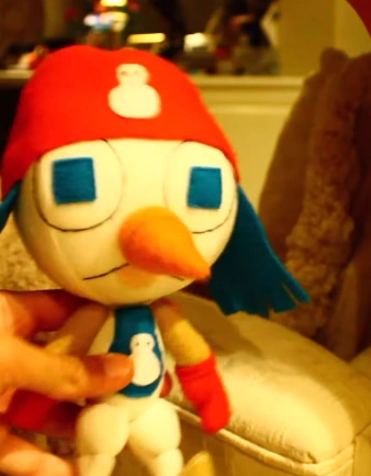 He also has a snowman emblem on his red bucket and his blue scarf-like flaps.